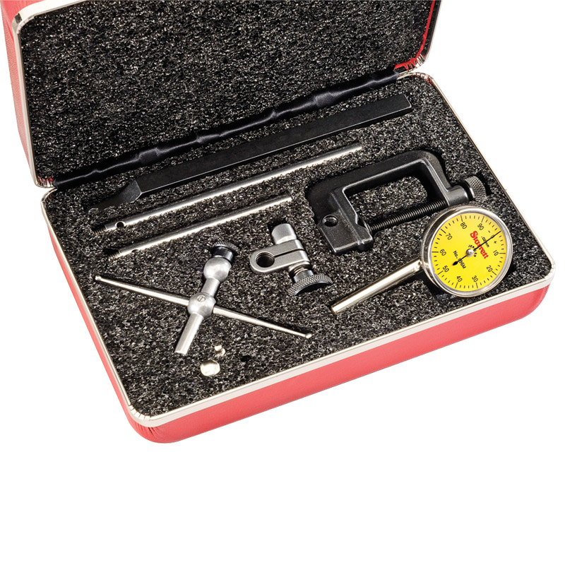 The Starrett 196 Universal Back Plunger Dial Indicator features graduations to .001" and 0.02mm that handle by far the majority of jobs. Shank diameter is 1/4" (6.3mm). Antimagnetic models are also available - (inch reading) 196A6Z and 196B6. For full use, the operator first chooses the proper contact from the three hardened contact points that come with each model. Then the contact should be brought against the work with enough pressure to give the hand one full turn. Set the hand at zero by rotating the dial with the knurled bezel. This provides one full rotation of the hand both to the right and left of zero, showing a rise or drop in the work and the amount of that variation. 0-100 with 3 Contact Points, Adapter, 4 Attachments in Case This provides one full rotation of the hand both to the right and left of zero, showing a rise or drop in the work and the amount of that variation.