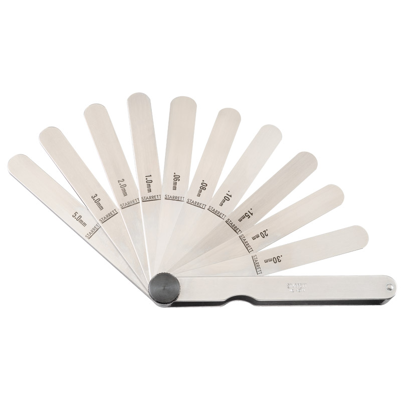 Leaves made of tempered steel, carefully finished to correct thickness, individually tested and marked. A locking device is furnished. Leaves may be easily removed or replaced. Millimeter Reading Thickness Gages with Straight Leaves. Range: 0.04, 0.05, 0.06, 0.07, 0.08, 0.10, 0.15, 0.20, 0.30, 1.0, 2.0, 3.0, 5.0mm