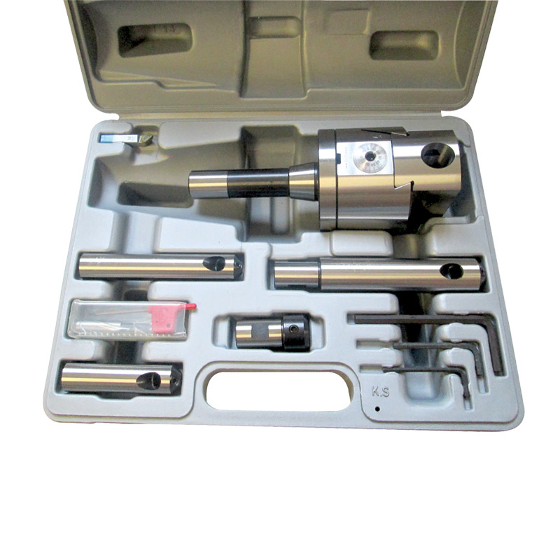 Processing Range: .4" - 10" (10-240mm). Dial Reading: .01mm. Rigid construction: Finest materials and craftsmanship are employed to combine strength, flexibility and accuracy in a tool of unique design. 2 vertical boring tool holes: one centered and one offset. One cross hole for greater versatility and capacity. Dependable adjustment: far spread graduations for closer reading. Perfectly balanced for high speed operation. Precision ground and hardened integral shank for rigidity and smooth operation. / Set includes boring head, fitted case, and an assortment of boring bars and holders to permit a great variety of machining operations.