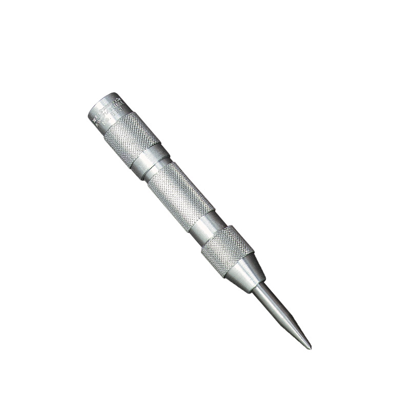 Lightweight aluminum handle. No hammer required. Can be adjusted for striking light or heavy indentations by turning knurled cap. Working parts are hardened tool steel. Point may easily be removed for resharpening or replacement. 5" long, 5/8" diameter.