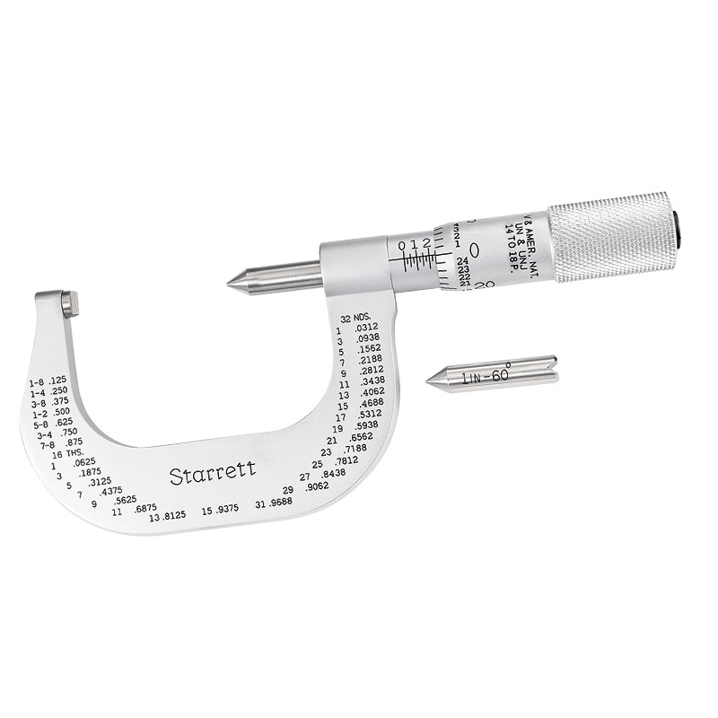 For measuring V, American National, Unified, and Unified J series screw threads. These micrometers have a pointed spindle and a double V-anvil, both shaped to contact the screw thread at the pitch diameter. The micrometer reading, therefore, gives the true pitch diameter which equals the outside diameter of the screw minus the depth of one thread. Frames are rigid, one-piece drop forged steel with no-glare satin chrome finish all over. One-piece hardened spindle with threads ground from the solid. Furnished with a fixed (non-rotating) anvil, without ratchet stop or lock nut, and appropriate standards.