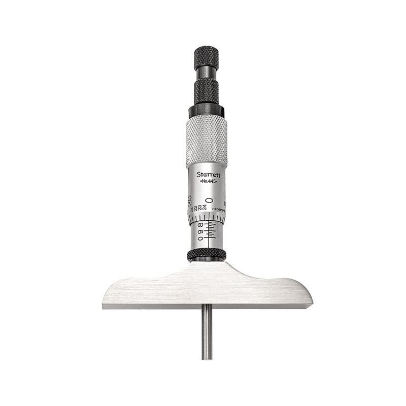 With ratchet stop, lock nut. Includes case. The depths of holes, slots, shoulders, and projections can be measured to .001" with these fine tools. The No. 440 gages are furnished with a 2-1/2" base and 1/8" diameter measuring rods. A base shape design that will automatically position the fingers so that the base is easily held in place for measuring stability. All precision screws are ground and lapped. All bases and rods are hardened ground, and lapped for permanent accuracy. All reading surfaces have a satin chrome finish that resists rust and provides a non-glare background for the sharp lines and figures. All measuring rods are adjustable. The combination ratchet and speeder for uniform pressure and quicker adjustment. Ring-type lock nut for quick and sure locking.