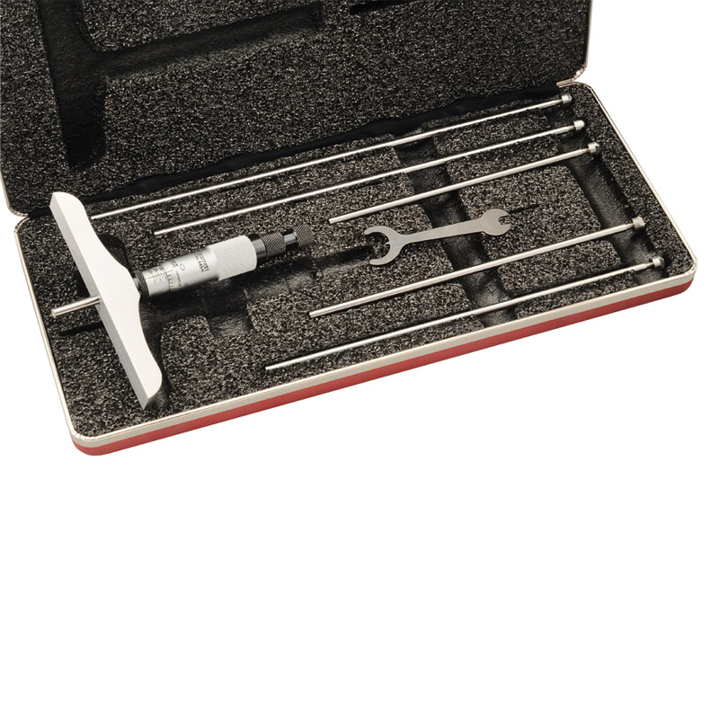 With ratchet stop, lock nut. Includes case. The depths of holes, slots, shoulders, and projections can be measured to .001" with these fine tools. The No. 440 gages are furnished with a 2-1/2" base and 1/8" diameter measuring rods. A base shape design that will automatically position the fingers so that the base is easily held in place for measuring stability. All precision screws are ground and lapped. All bases and rods are hardened ground, and lapped for permanent accuracy. All reading surfaces have a satin chrome finish that resists rust and provides a non-glare background for the sharp lines and figures. All measuring rods are adjustable. The combination ratchet and speeder for uniform pressure and quicker adjustment. Ring-type lock nut for quick and sure locking.