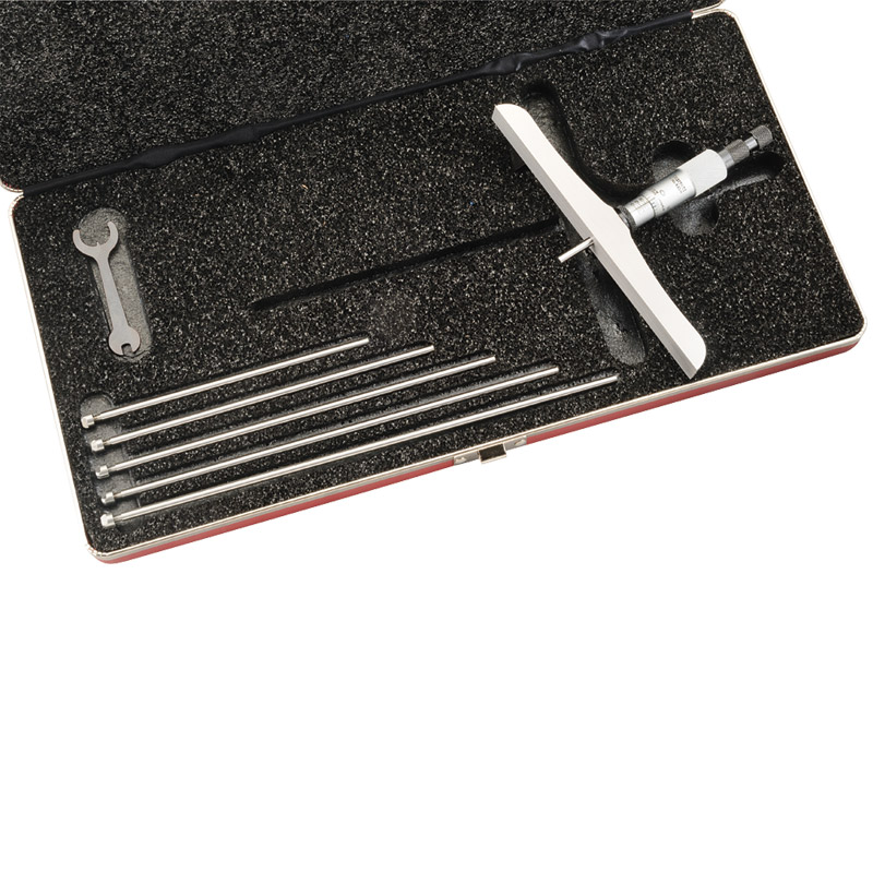 With ratchet stop, lock nut. Includes case. The depths of holes, slots, shoulders, and projections can be measured to .001" with these fine tools. The No. 440 gages are furnished with a 2-1/2" base and 1/8" diameter measuring rods. A base shape design that will automatically position the fingers so that the base is easily held in place for measuring stability. All precision screws are ground and lapped. All bases and rods are hardened ground, and lapped for permanent accuracy. All reading surfaces have a satin chrome finish that resists rust and provides a non-glare background for the sharp lines and figures. All measuring rods are adjustable. The combination ratchet and speeder for uniform pressure and quicker adjustment. Ring-type lock nut for quick and sure locking.