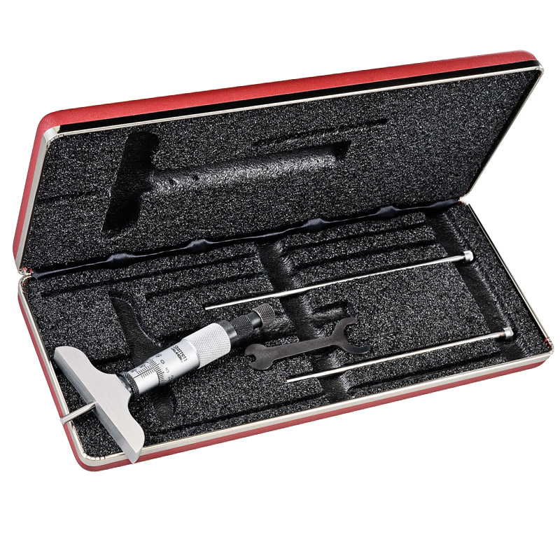 With ratchet stop, lock nut. Includes case. The depths of holes, slots, shoulders, and projections can be measured to 0.01mm with these fine tools. The No. 440 gages are furnished with a 63mm base and 3.2mm diameter measuring rods. A base shape design that will automatically position the fingers so that the base is easily held in place for measuring stability. All precision screws are ground and lapped. All bases and rods are hardened ground and lapped for permanent accuracy. All reading surfaces have a satin chrome finish that resists rust and provides a non-glare background for the sharp lines and figures. All measuring rods are adjustable. The combination of ratchet and speeder for uniform pressure and quicker adjustment. Ring-type lock nut for quick and sure locking.