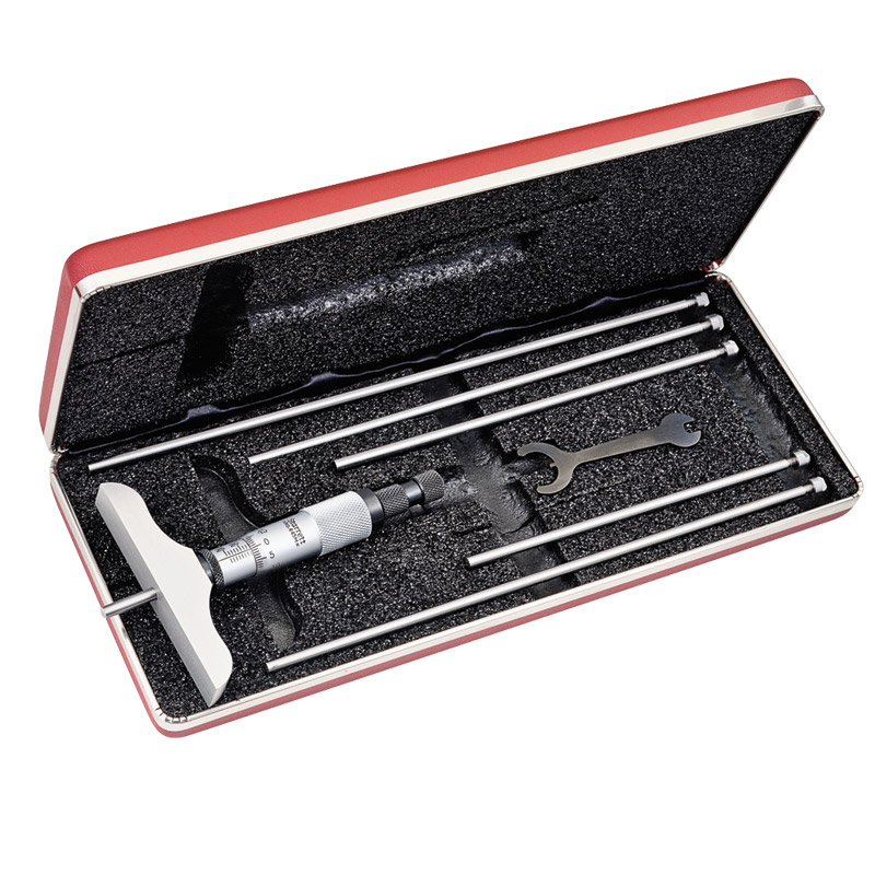 With ratchet stop, lock nut. Includes case. The depths of holes, slots, shoulders, and projections can be measured to 0.01mm with these fine tools. The No. 440 gages are furnished with a 63mm base and 3.2mm diameter measuring rods. A base shape design that will automatically position the fingers so that the base is easily held in place for measuring stability. All precision screws are ground and lapped. All bases and rods are hardened ground and lapped for permanent accuracy. All reading surfaces have a satin chrome finish that resists rust and provides a non-glare background for the sharp lines and figures. All measuring rods are adjustable. The combination of ratchet and speeder for uniform pressure and quicker adjustment. Ring-type lock nut for quick and sure locking.