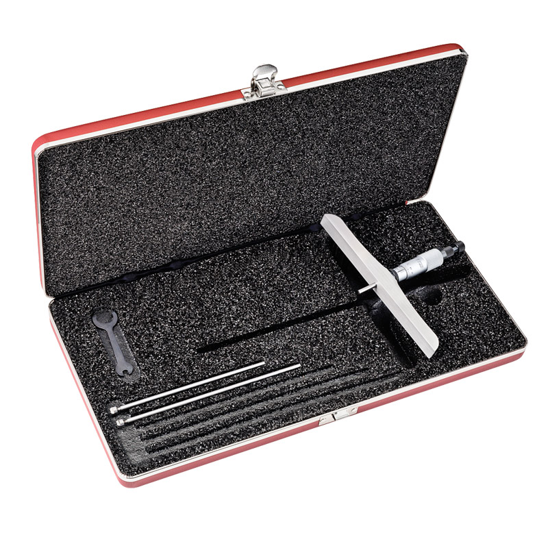With ratchet stop, lock nut. Includes case. The depths of holes, slots, shoulders, and projections can be measured to 0.01mm with these fine tools. The No. 440 gages are furnished with a 63mm base and 3.2mm diameter measuring rods. A base shape design that will automatically position the fingers so that the base is easily held in place for measuring stability. All precision screws are ground and lapped. All bases and rods are hardened ground and lapped for permanent accuracy. All reading surfaces have a satin chrome finish that resists rust and provides a non-glare background for the sharp lines and figures. All measuring rods are adjustable. The combination of ratchet and speeder for uniform pressure and quicker adjustment. Ring-type lock nut for quick and sure locking.