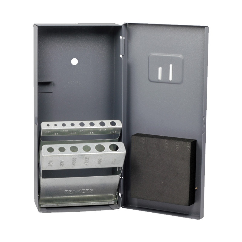 CZ112, for 14 piece set. Over and Under sizes .124 - .126 to .499 - .501 by 16ths. Holds 14 reamers. All-steel reamer cases. Holds reamer securely by the shank to help protect delicate cutting edges. Indexed for reamer size in decimal equivalents. Raised embossed lettering for permanent identification. Each storage hole precisely sized for accurate, quick tool selection. Corrosion resistant, epoxy baked on coating. Secure, snap-lock steel cover. Rugged, heavy gauge steel case.