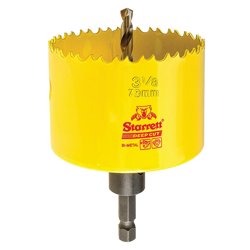 Dual Pitch Professional Hole Saws with Quickshot Arbor. Hardened, heat resistant, positive rake HSS teeth with alloy backing. Strong and shatter resistant. Economically cuts wood, metal and steel. For hand held or fixed drills.